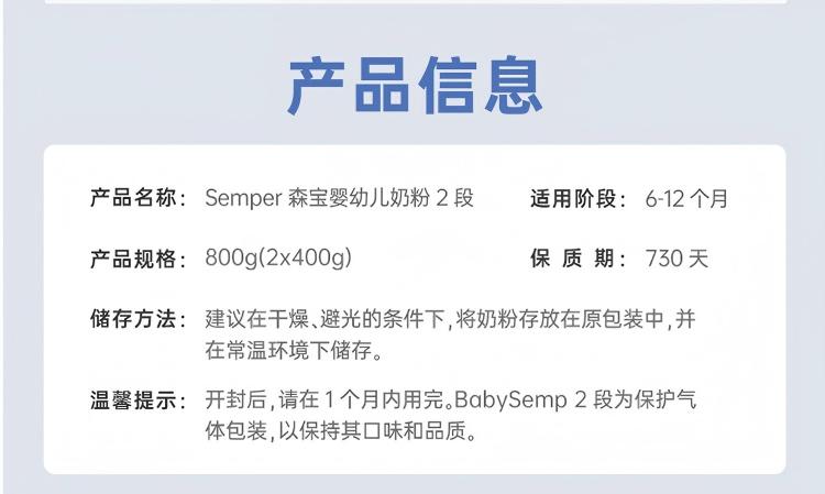 瑞典Semper SE 森宝婴幼儿配方奶粉2段800g