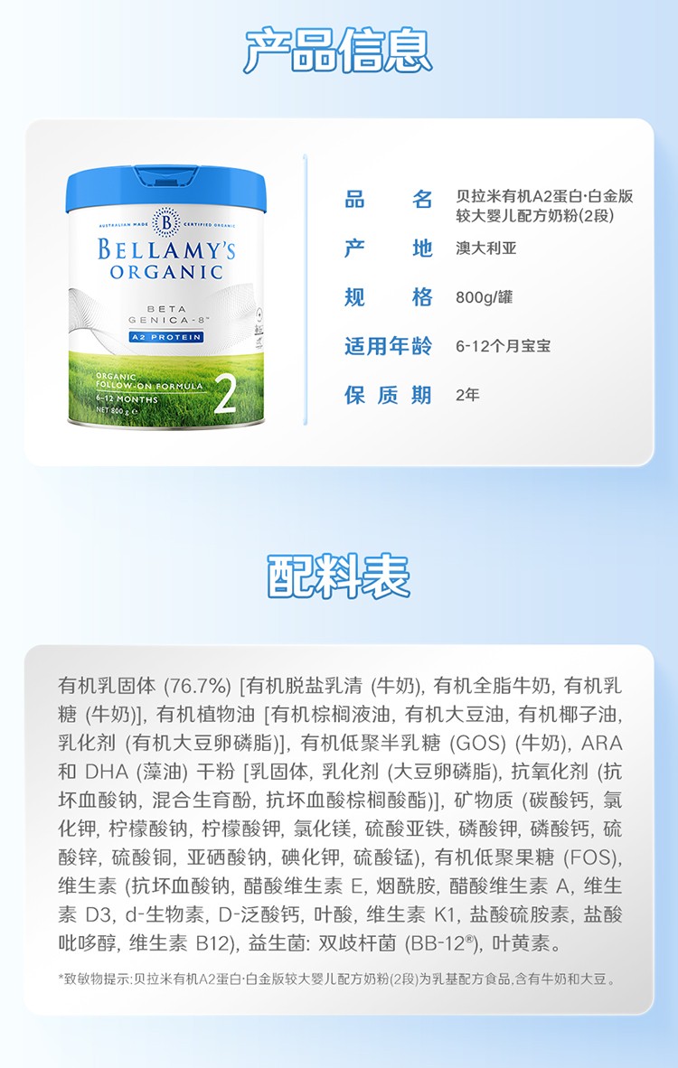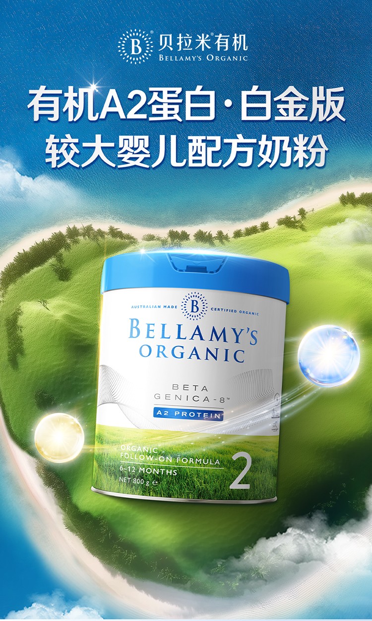澳洲贝拉米Bellamy‘s Organic白金版有机A2蛋白奶粉2段800g(新旧随机)