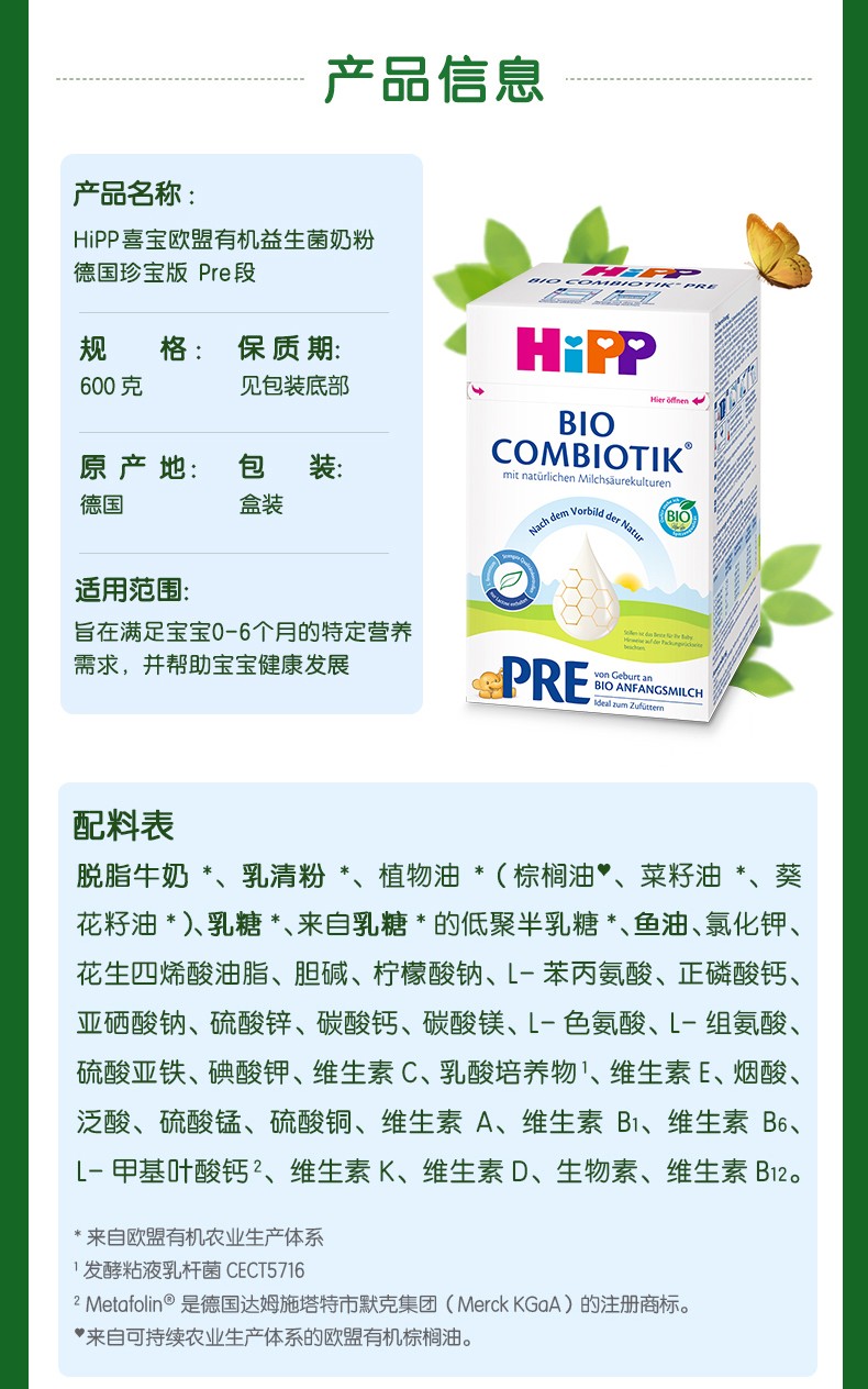 德国 喜宝(HiPP)益生菌奶粉 Pre段600g