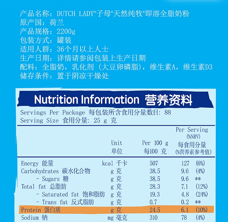 Dutch Lady 港版 子母天然纯牧即溶全脂奶粉2200g
