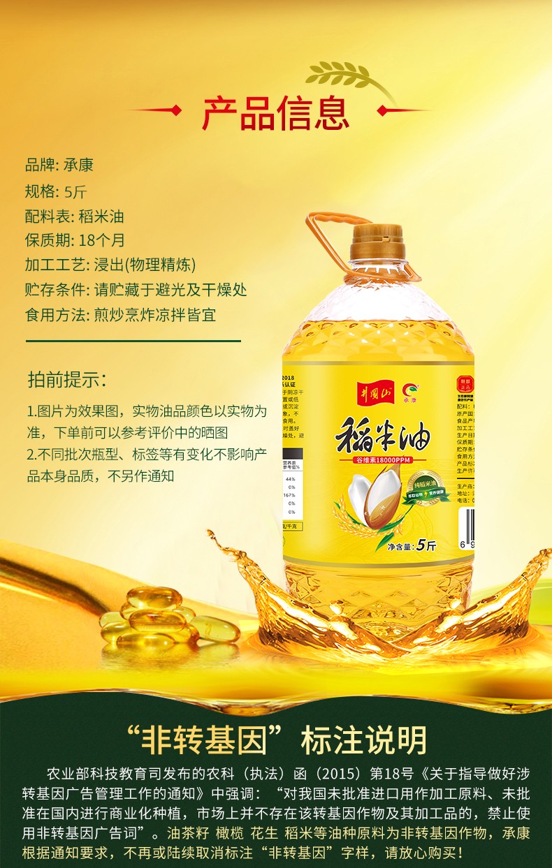 承康 新鲜纯稻米油 米糠油 谷维素18000PPM 5斤/桶