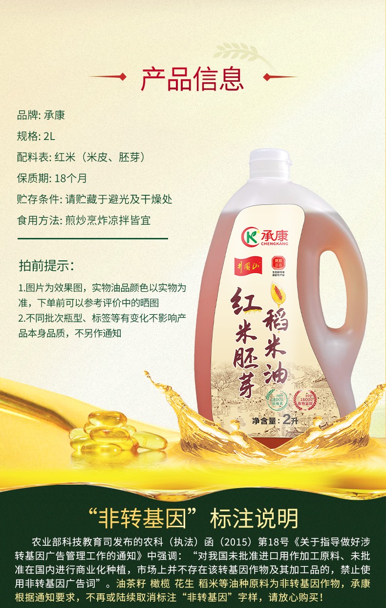 承康 纯红米胚芽稻米油(谷维素18000PPM)2L/桶