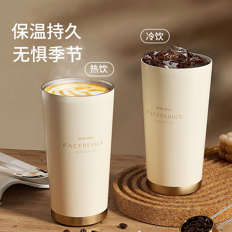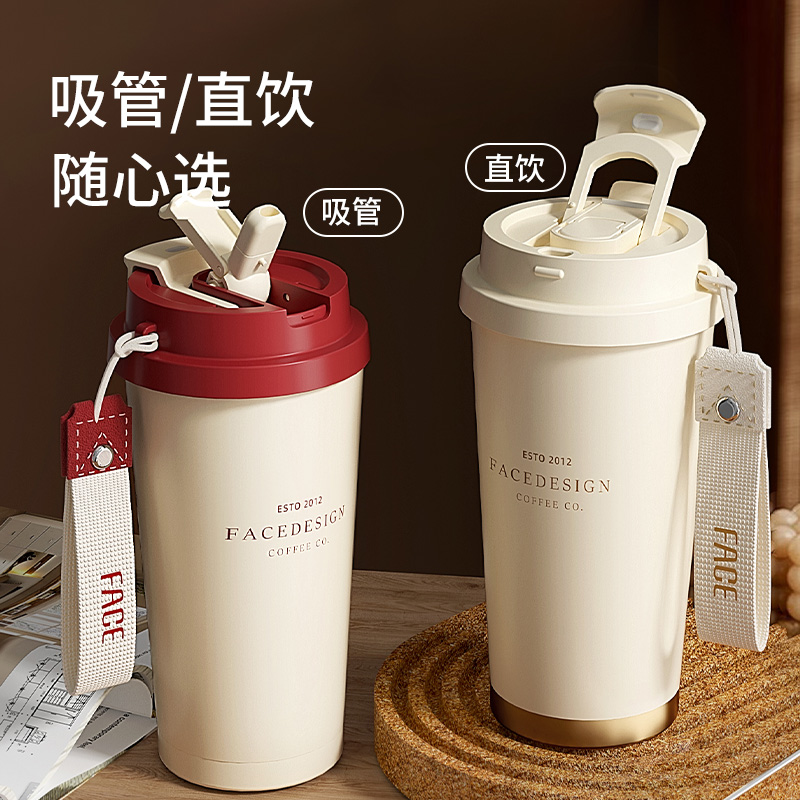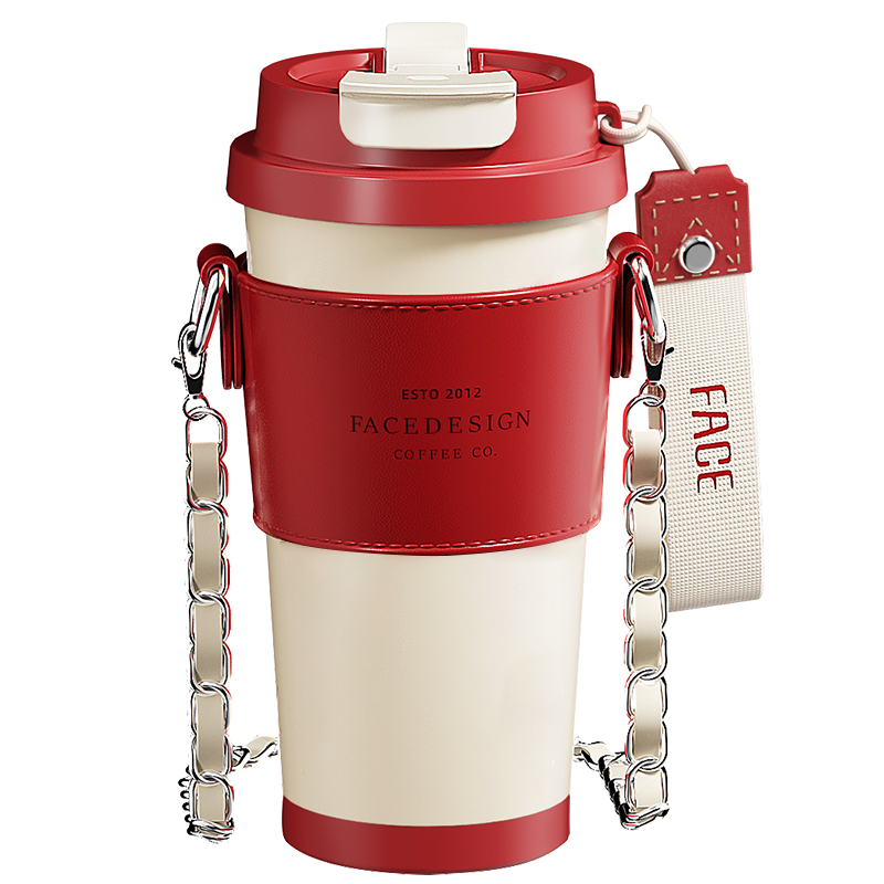 FACE 双饮手提咖啡杯316不锈钢陶瓷涂层无图案+杯套【红色】(530ml)
