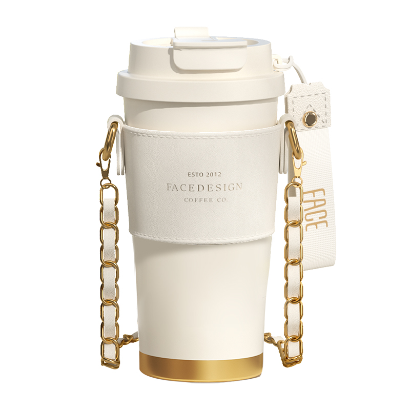 FACE 双饮手提咖啡杯316不锈钢陶瓷涂层无图案+杯套【金色】(530ml)